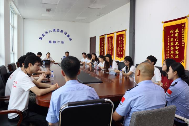 7月4日上午,调研团来到鸭绿江国门景区调研集安公路、铁路口岸,实地参观边检工作流程,并与集安出入境边防检查站相关领导开展座谈。调研团师生围绕边检单位文化建设、职能管理、民族团结等方面工作提问,详细了解了边检单位的日常工作状况和文化建设工作。